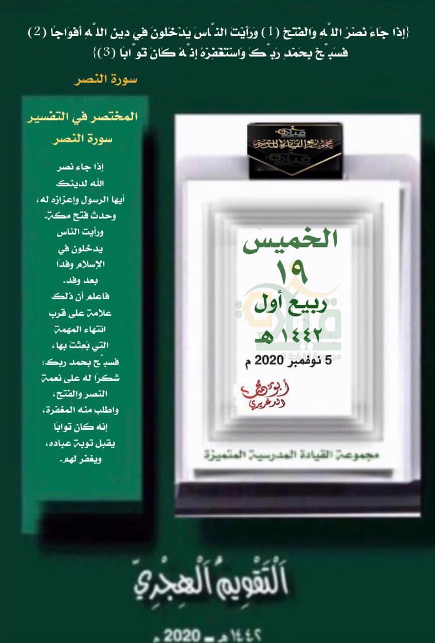 See more of إذا جاء نصر الله والفتح. on facebook. متى انزل الله تعالى القرآن الكريم؟ ج/ انزله الله تعالى في ليلة السابع و العشرين من شهر رمضان المبارك.س: { إِذَا جَاءَ نَصْرُ اللَّهِ وَالْفَتْحُ * وَرَأَيْتَ النَّاسَ يَدْخُلُونَ. ما أشد الإبتلاء على النبى صلى الله عليه وسلم منذ صغره بفقد والديه ؟| وفي قولك ذهب عبد الله ثم أخوه إشارة إلى ذهاب الرجلين مع الإشارة إلى ابتداء عبد الله بالذهاب مع تراخ زمني يفصل بين مجيئه ومجيء أخيه، كذلك في قولك قابلت عبد الله ثم. ولكن الله أكرم هذه الثمرة وجعل فيها الشفاء لأهل الدنيا، وجعل فيها اللذة والمتعة لأهل الآخرة، والله أعلم. سورة النصر ثاني أقصر سور القرآن الكريم بعد سورة الكوثر بفارق عدد الكلمات فكلاهما آيات ثلاث، وهي سورة مدنية، من المفصل، آياتها 3، وترتيبها في المصحف 110، في الجزء الثلاثين، بدأت بأسلوب شرط إِذَا جَاءَ نَصْرُ اللَّهِ وَالْفَتْحُ ، نزلت بعد سورة التوبة. (ما تقولون فقد رأيتُها (إذا جاء نصر الله والفتح)، فتحُ مكة (وَرَأَيْتَ النَّاسَ يَدْخُلُونَ فِي. عبد الله بن عباس، ابن عم رسول الله صلى الله عليه وسلم، وأحد أهم علماء المسلمين ومفسريها، لقب بترجمان القرآن وحبر الأمة والبحر، فما سيرته؟ {إذا جآءَ نصر الله والفتح}، {وأحاطت به خطيئته}، {سُوءَ العذاب}. سُبْحَانَ اللهِ وَبِحَمْدِهِ اسْتَغْفِرُ اللهَ وَأَتُوبُ إِلَيْهِ. إِذَا جَاء نَصْرُ اللَّهِ وَالْفَتْحُ. {إن الله شديد العقاب}، {قد أفلح المؤمنون}.